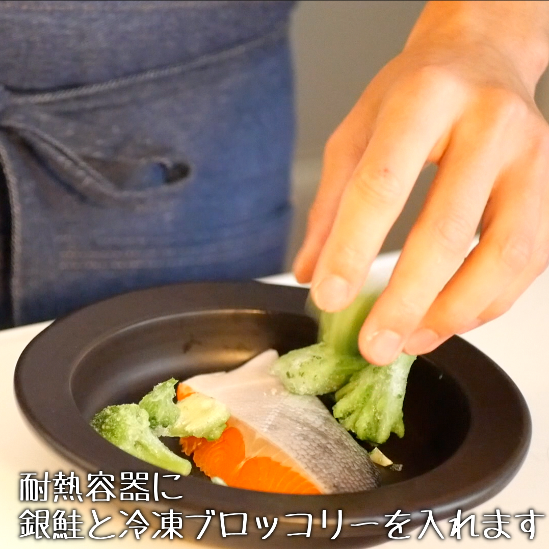 耐熱容器に銀鮭と冷凍ブロッコリーを入れます。