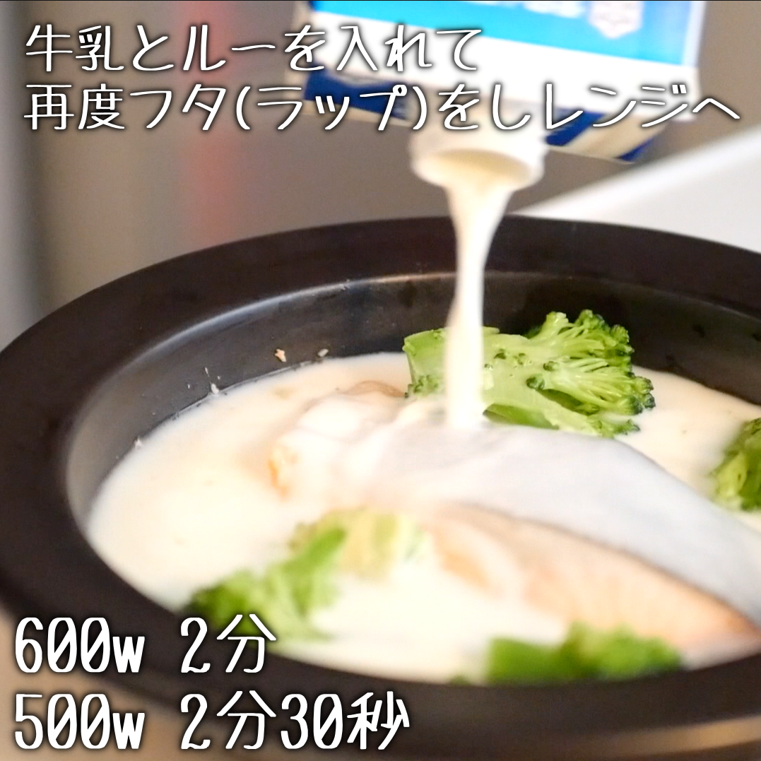 ①に牛乳、クリームシチューのルーを加え、再度フタをして(またはラップをかけて)600Wの電子レンジで2分(500Wの場合、2分30秒)加熱します。