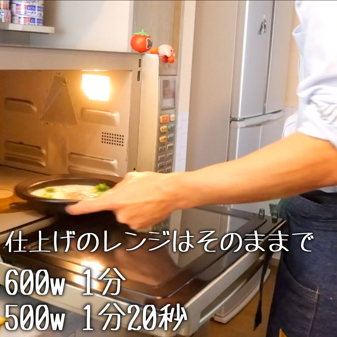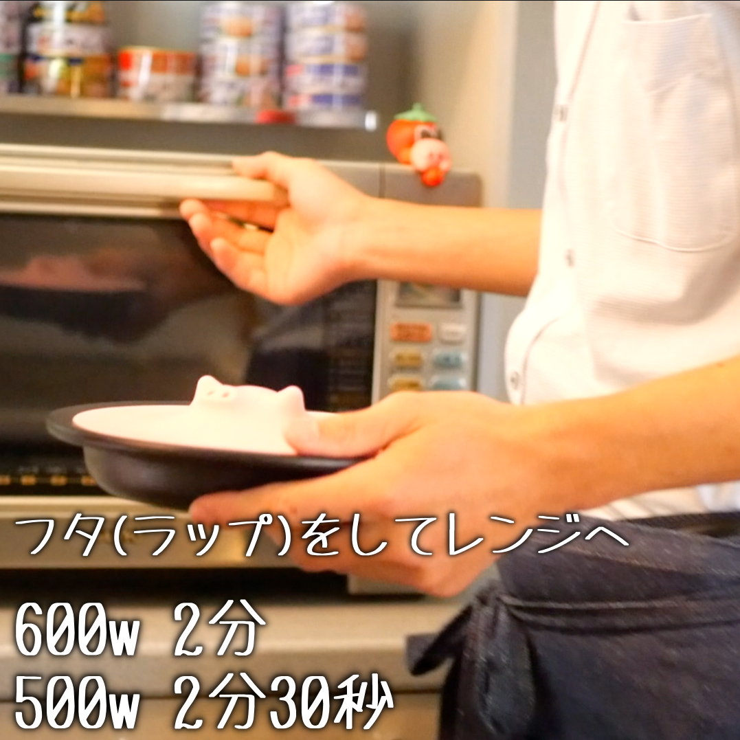 フタをしないで600Wの電子レンジで1分(500Wの場合、1分20秒)加熱します。