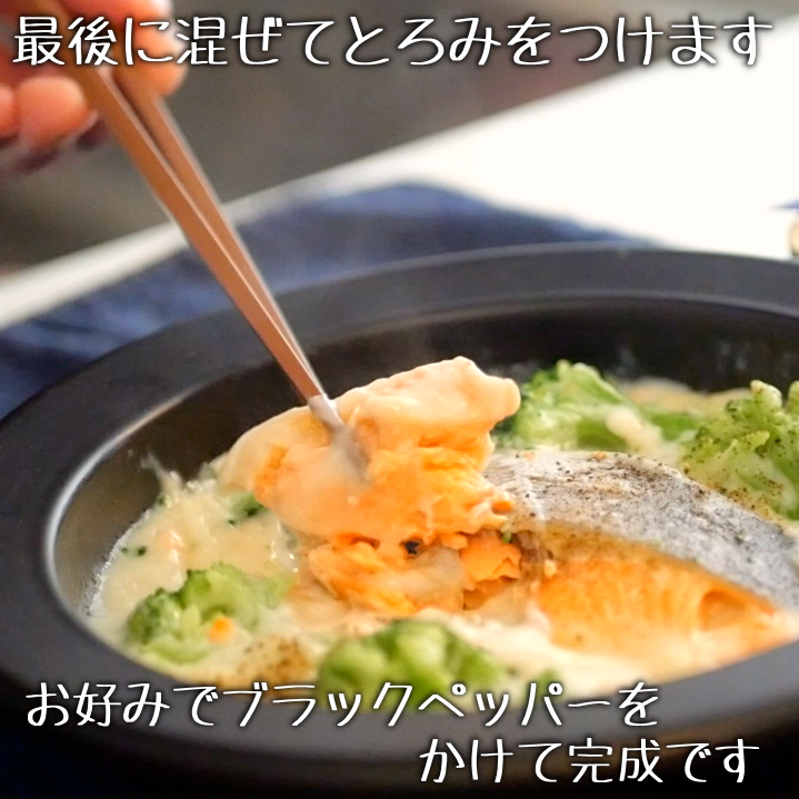 ・鮭の切り身(生鮭) … 1切れ・冷凍ブロッコリー … 5房・牛乳 … 100cc・シチュールー … 1かけら・ブラックペッパー … お好みで コツ・ポイントルーを溶かす時は、鮭とブロッコリーを動かすように混ぜるとムラなく混ざりやすくなります。