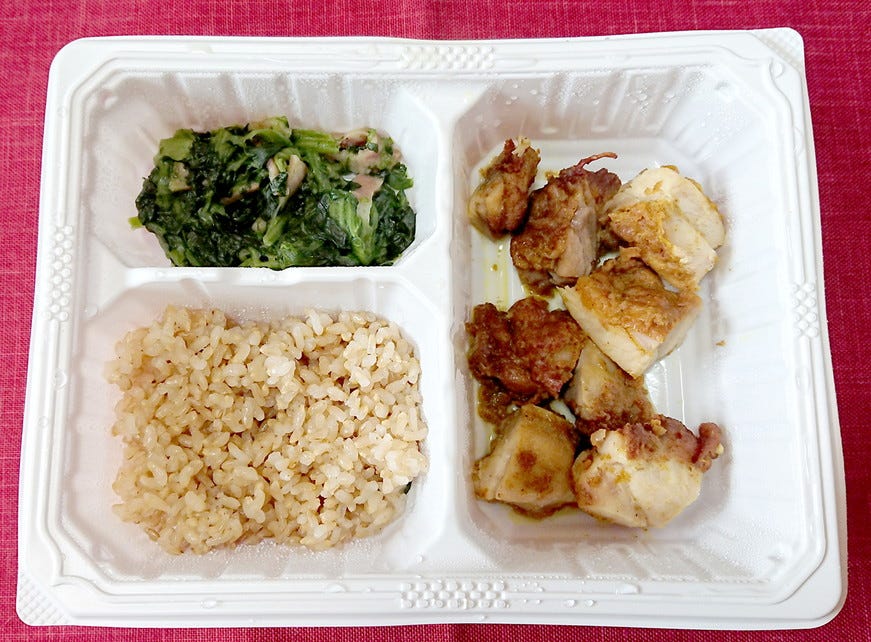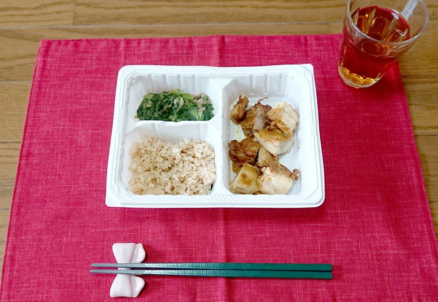 玄米ご飯は硬めながらふっくら炊けていて、しっかり咀嚼すれば少量でも満腹感が得られます。主食とおかずのセットなのでこれだけで完結。主食を別に準備する必要がありません。