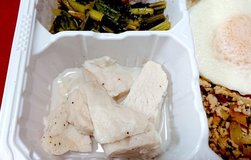 加熱時のふんわりやさしいスパイシーな香りが鼻をくすぐる。チキンは皮つきで、プルンとしたコラーゲン質の食感と酸味のあるスイートソースが美味しい。