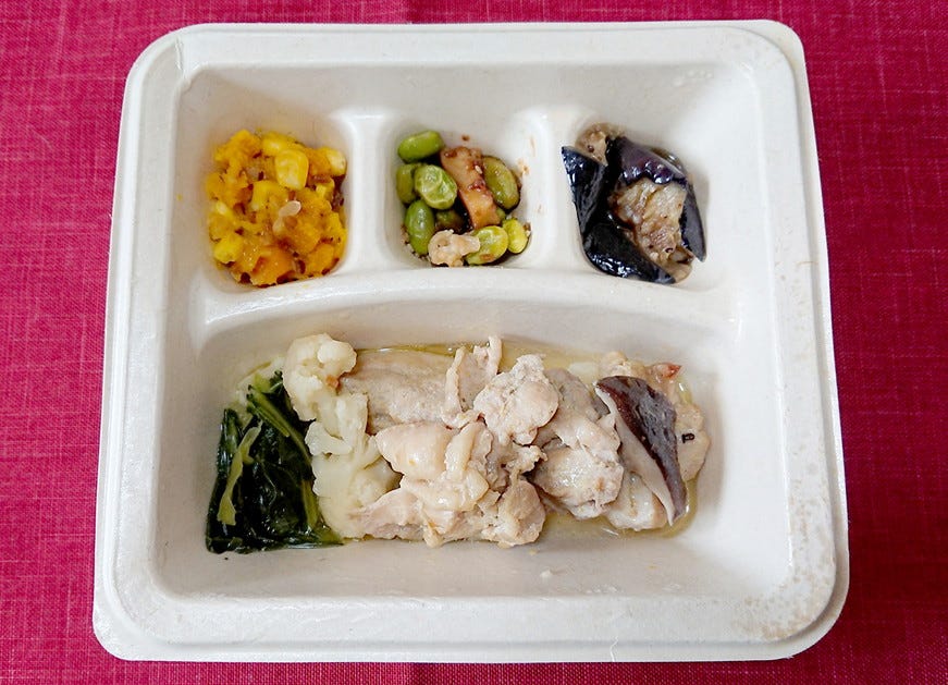 レンジで温めているときから柚子胡椒の芳ばしい香りが漂い、食欲をそそります。焼き鳥はやわらかくジューシーで、柚子胡椒が爽やかな後味。ナスは、薄味でトロトロの食感にまでよく炊き込まれ、カボチャの和え物は甘すぎず付け合わせとしての役割をしっかりと果たしています。