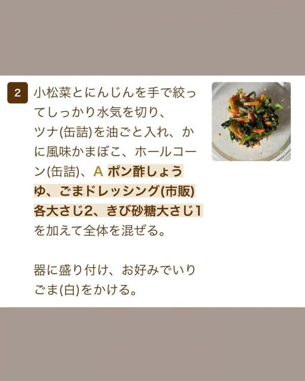 ②小松菜とにんじんを手で絞ってしっかり水気を切り、ツナを油ごと入れ、かに風味かまぼこ、ホールコーン、Aを加えて全体を混ぜる。