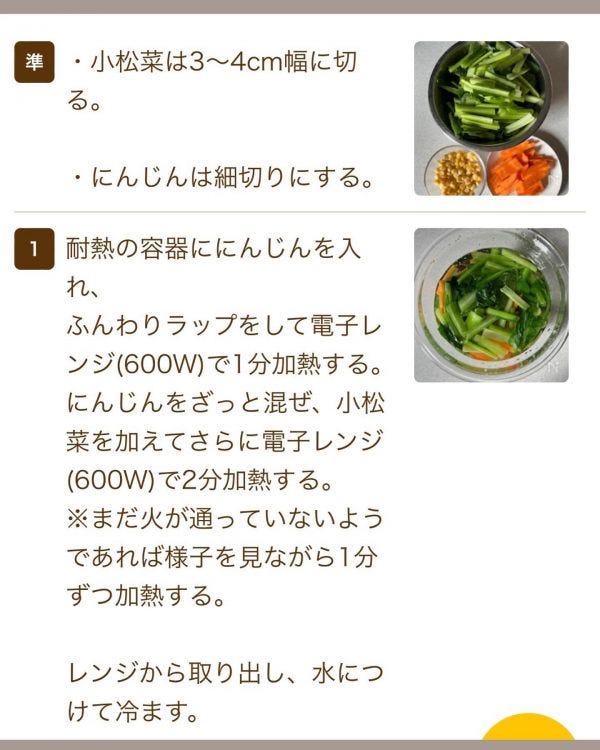 にんじんをざっと混ぜ、小松菜を加えてさらに電子レンジで2分加熱する。