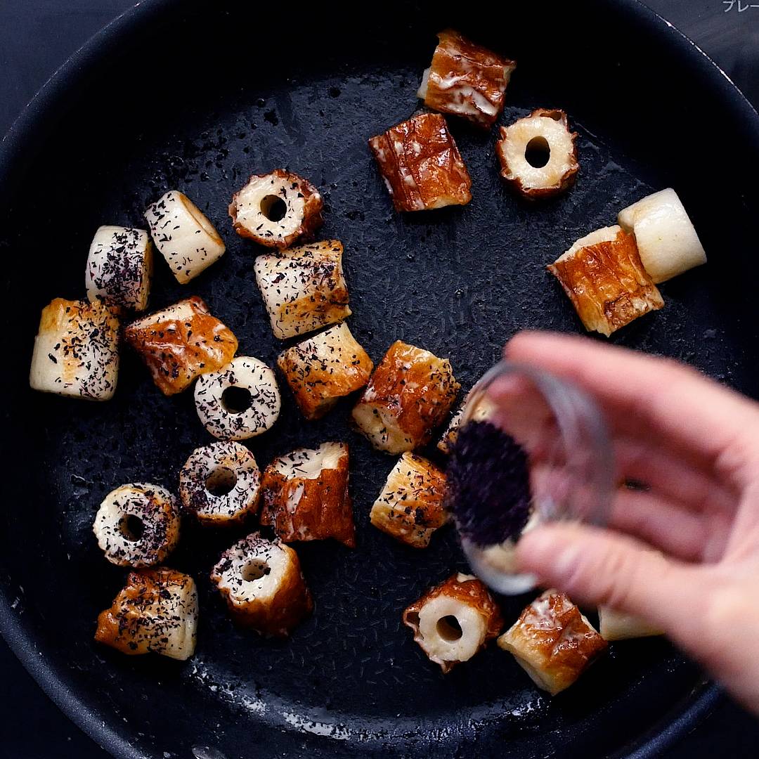 ・ちくわ … 5本・ゆかり … 小さじ2/3杯・マヨネーズ … 大さじ1杯・粉チーズ … 少々・天かす … 4g【作り方】無限ちくわ