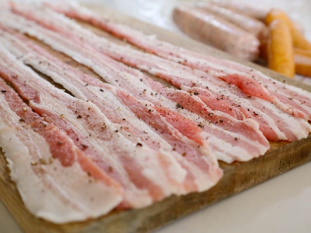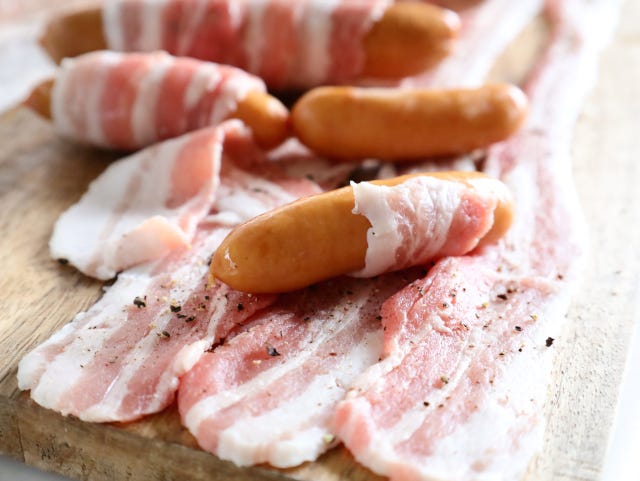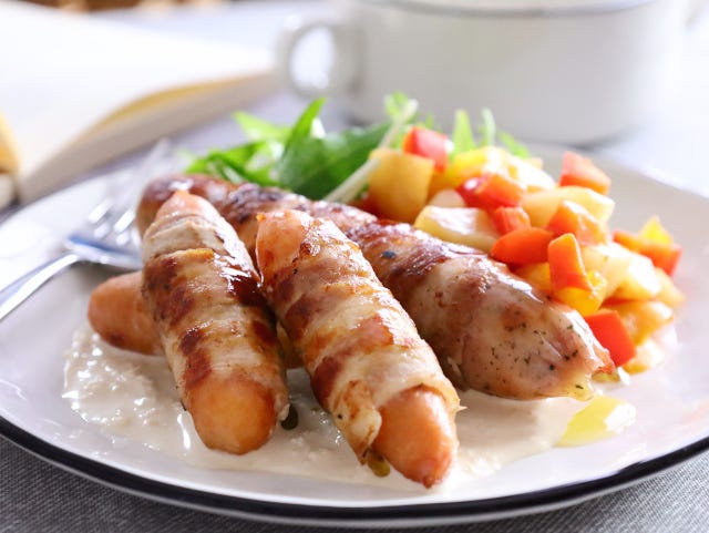 ③ 残りの豚バラ肉は、半分に切り、ソーセージを乗せて同様に巻いていく。