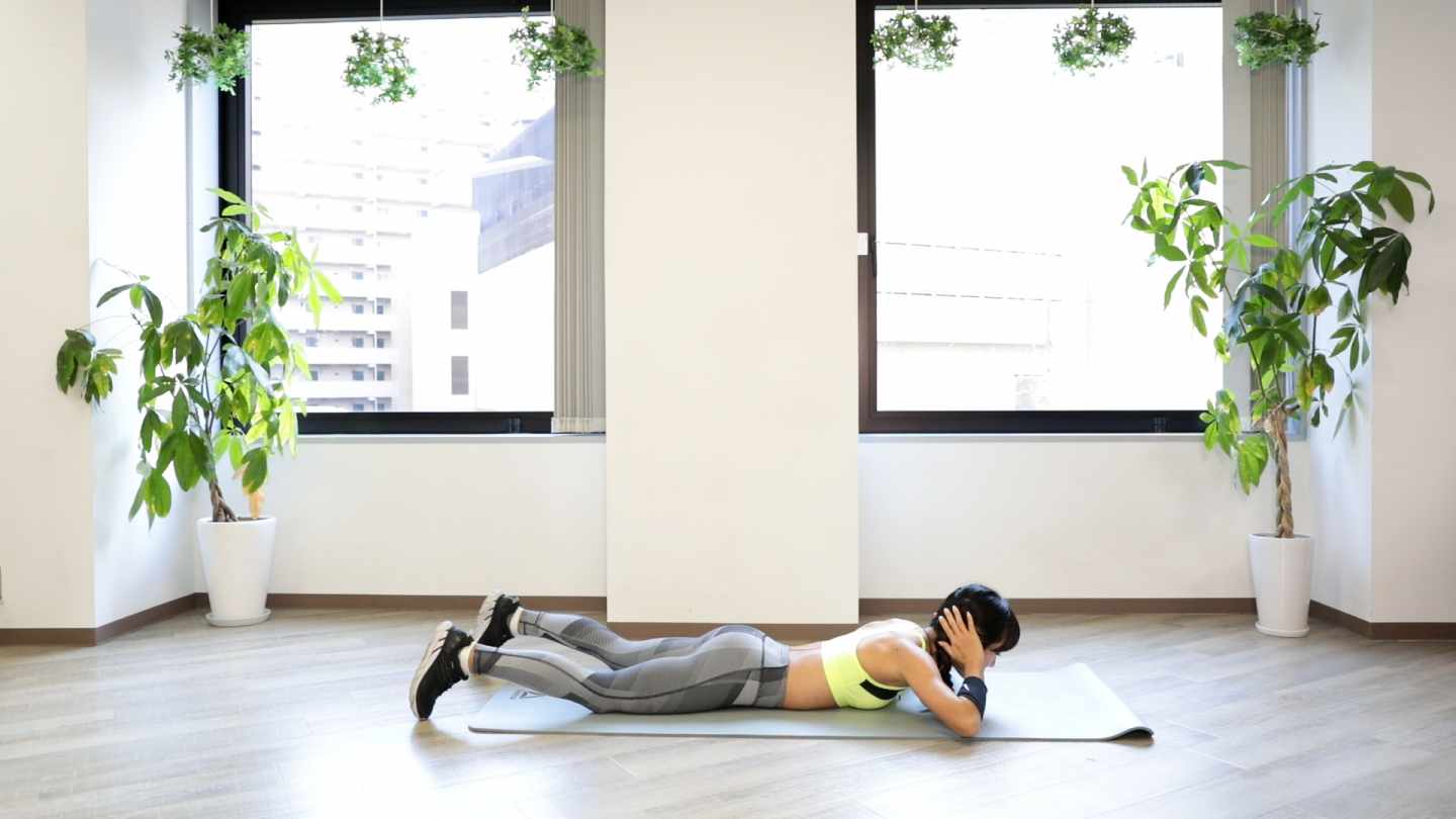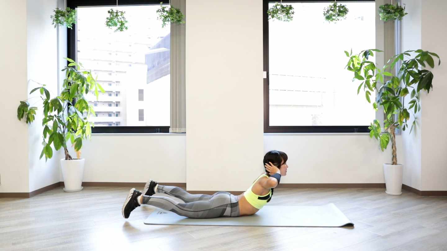 バックエクステンション うつぶせで寝て、肘を曲げ、顔の両脇に置く 上体を床から浮かせ、限界まで上げたら元の姿勢に戻る この動作を繰り返し行う
