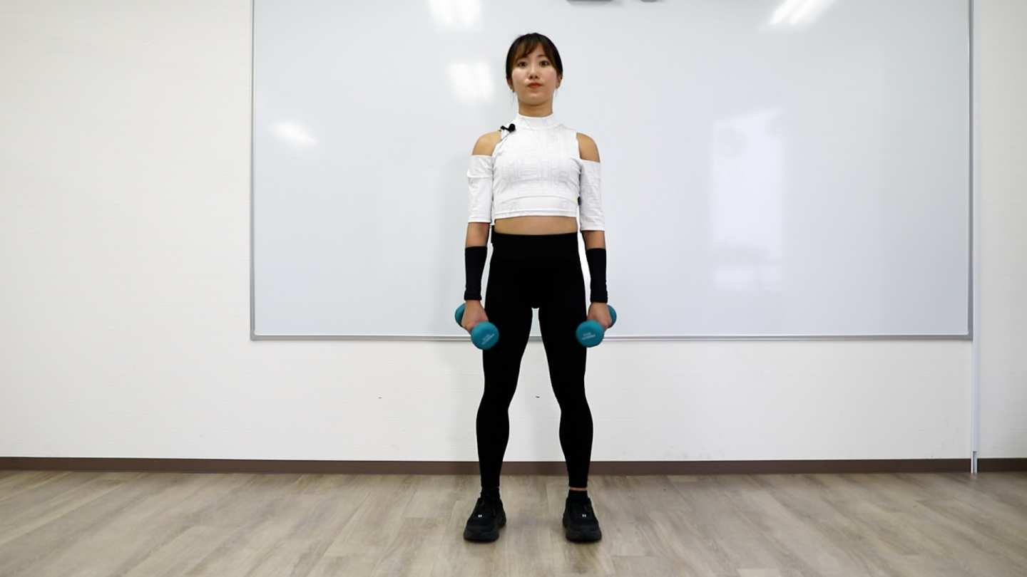 基本の動作 足を腰幅に開いて立ち、つま先は正面に向ける 両手にダンベルを持ち、カラダの前面に沿わせながら足首まで下ろす カラダの前面に沿わせながら元の姿勢に戻る