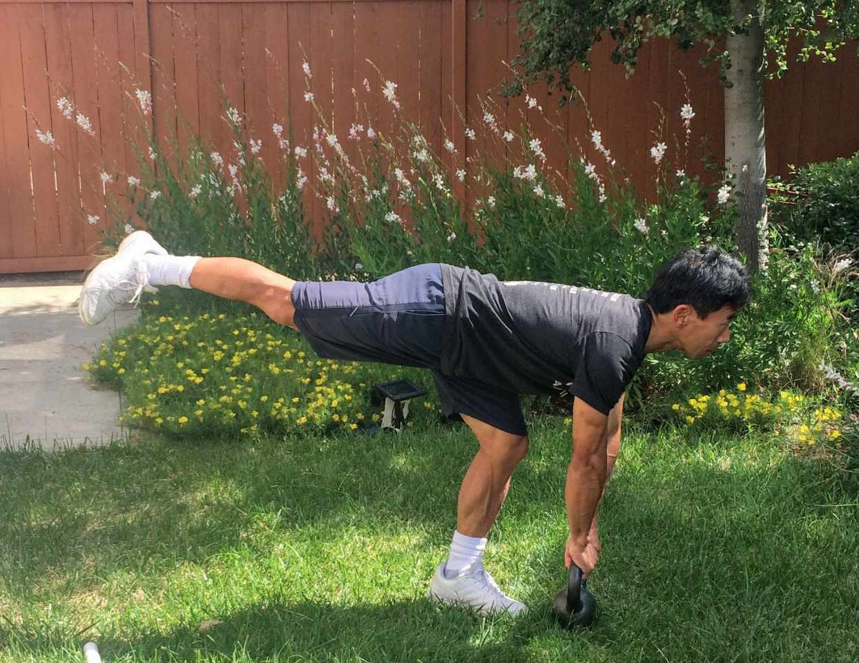 ルーマニアンデッドリフト 足を腰幅に開いて立ち、つま先は正面に向ける 両手で重りを持って立ち、軽く膝を曲げる お尻を後ろに突き出すように重りを下ろす 元の姿勢に戻る