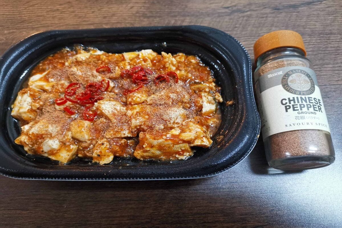 そこで、プロがアドバイスしていた「スパイスの小袋をつける」を実践。今回は瓶の中国山椒(花椒)をかけて食べてみたが、麻婆豆腐の旨味が強いため香りの強い中国山椒との相性がバツグンで、かなり美味しくなった。