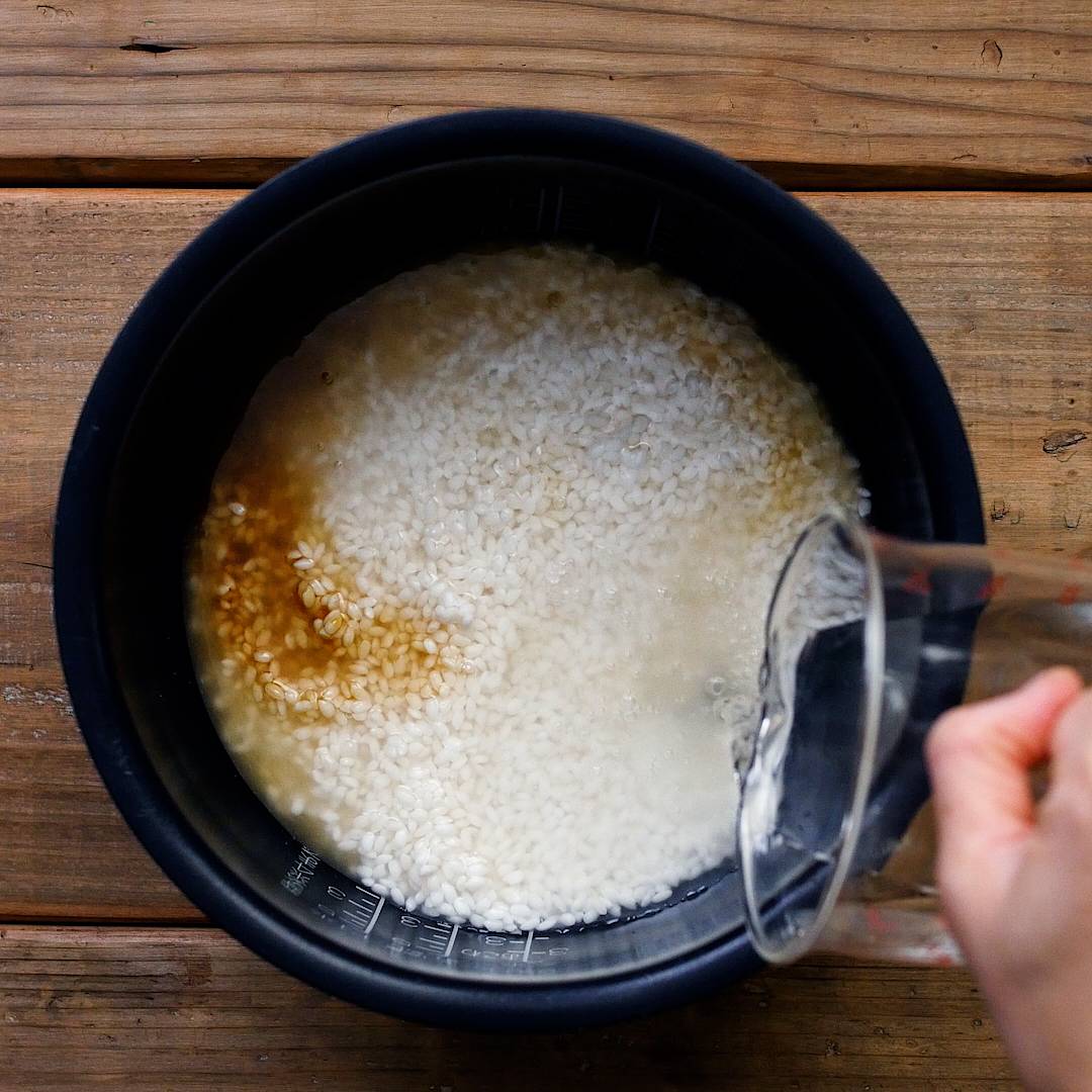 炊飯器に米、酒、しょうゆ、水を入れます。