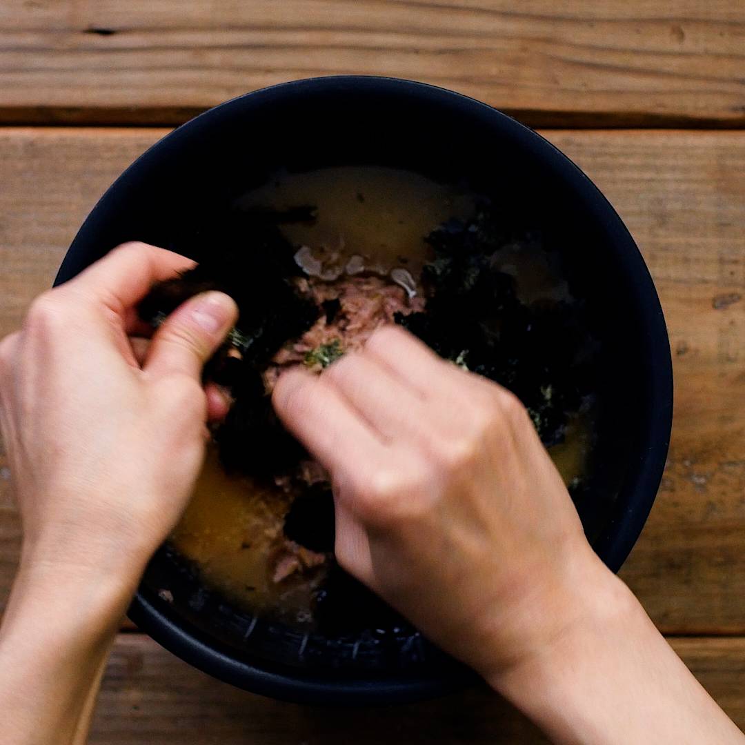 ツナ缶、なめたけ、のりをちぎりながらのせます。