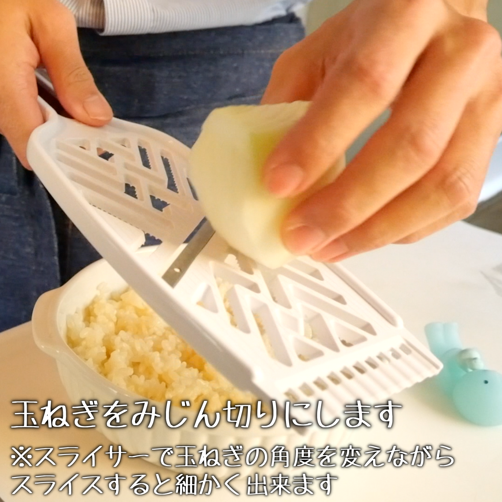 玉ねぎをスライサーでみじん切りにし、①の上に広げます。 スライサーの角度を変えながら、細かいみじん切りになるようにしてください。