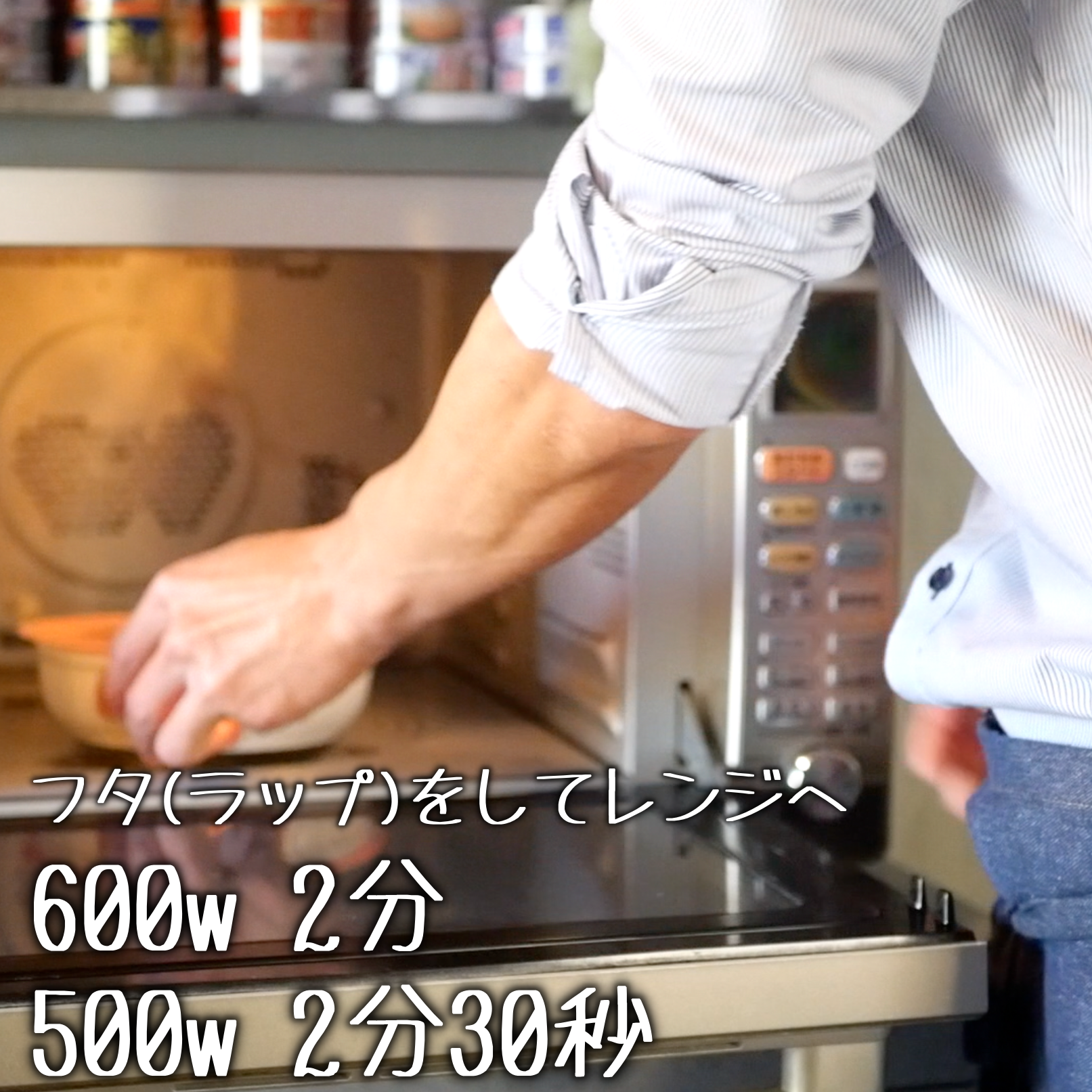 フタをして(またはラップをかけて)600Wの電子レンジで2分(500Wの場合、2分30秒)加熱します。