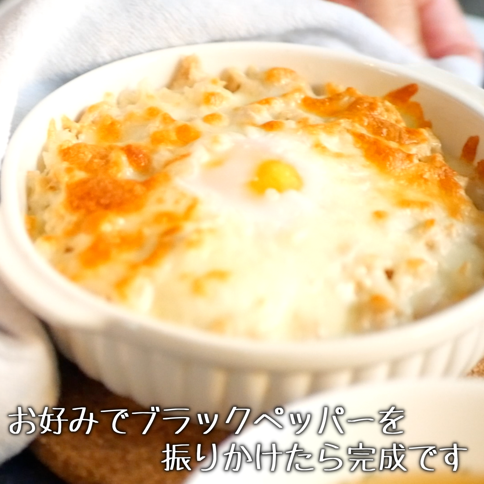 お好みでブラックペッパーを振りかけて完成です。 ※レンジのみで加熱した場合は、ここで中央に卵黄をのせ、ブラックペッパーを振りかけて完成です。