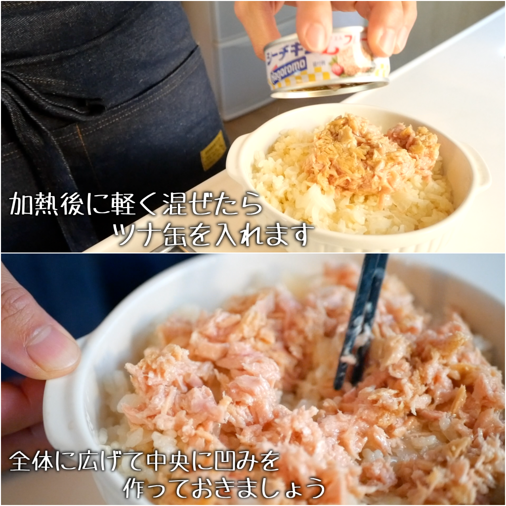 レンジから取り出して軽く混ぜ、ツナを全体に広げます。 中央に、卵を入れるための凹みを作っておきます。