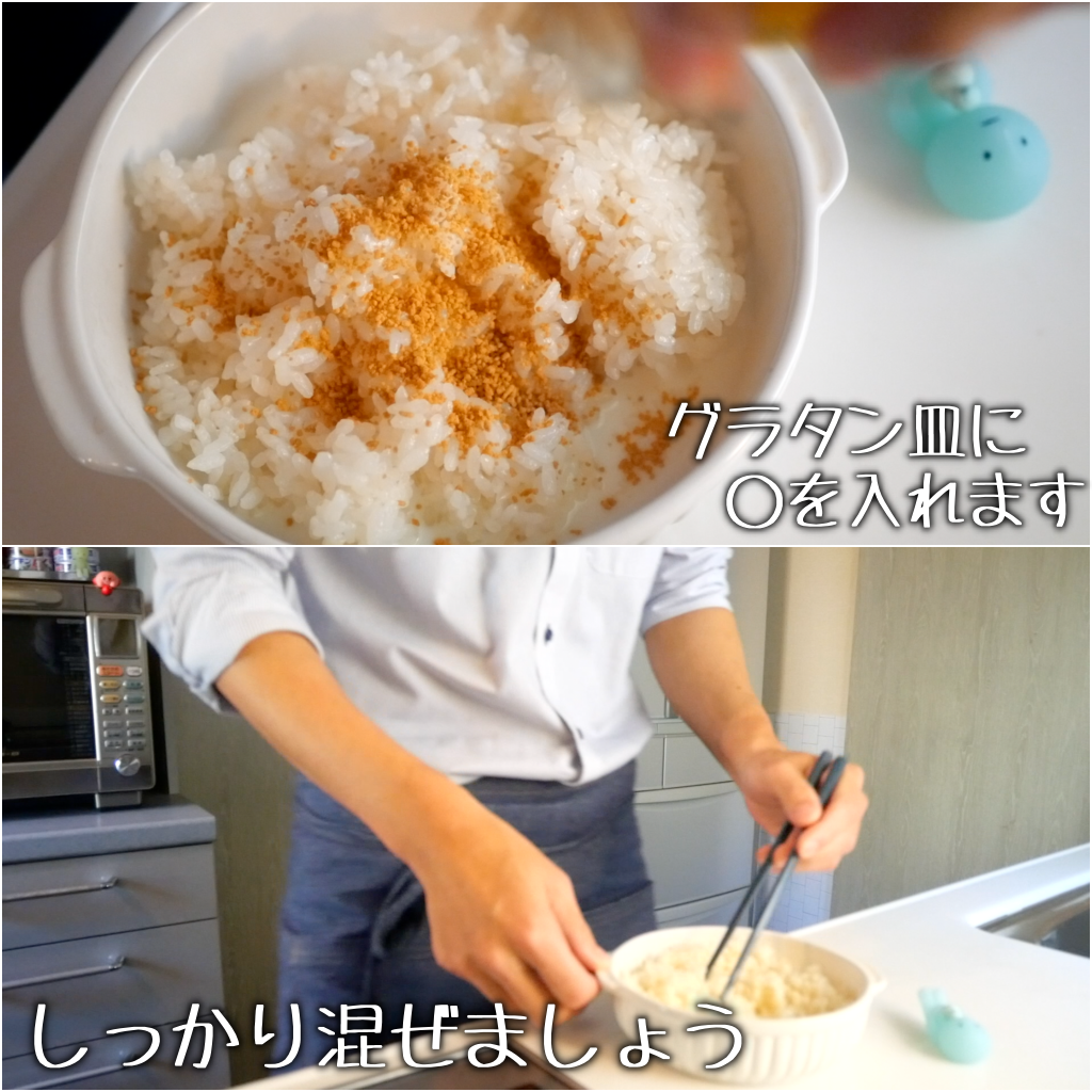 ピラフ風味ごはんの材料をグラタン皿に入れてよく混ぜます。