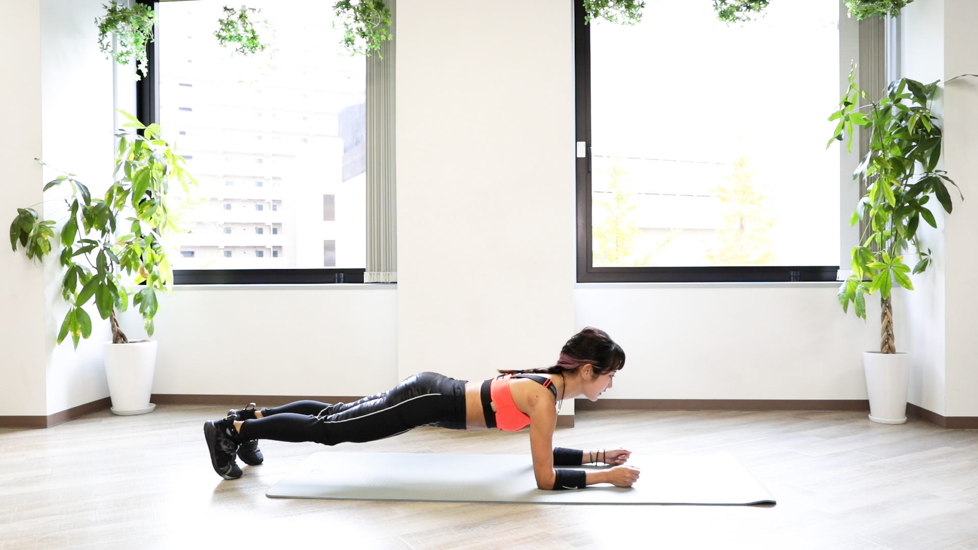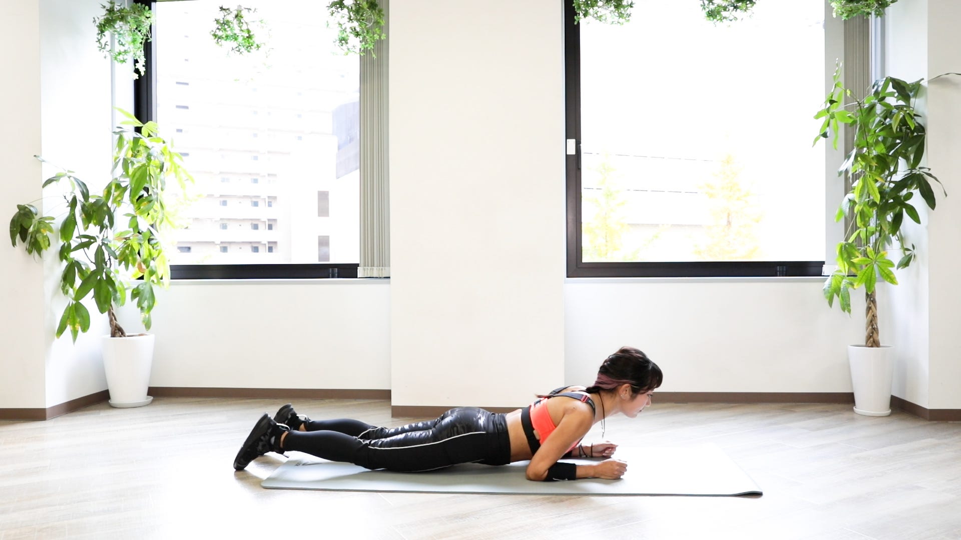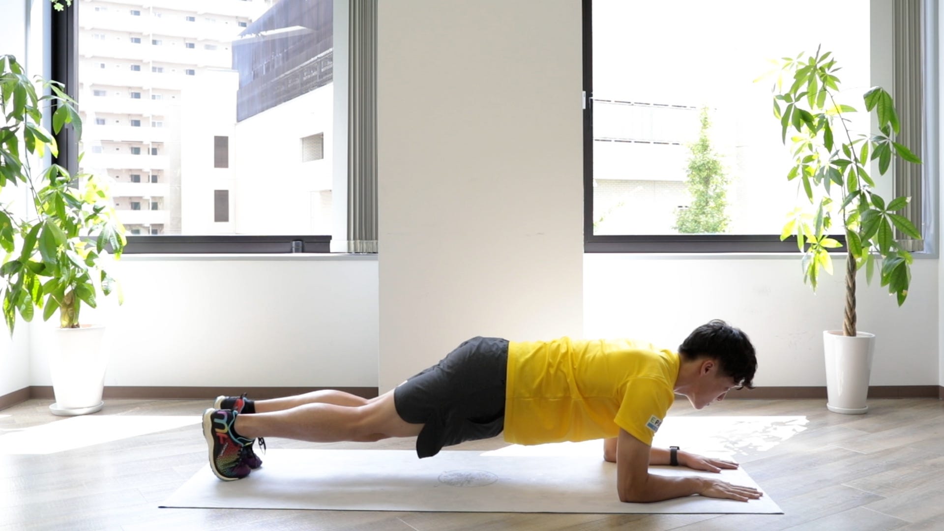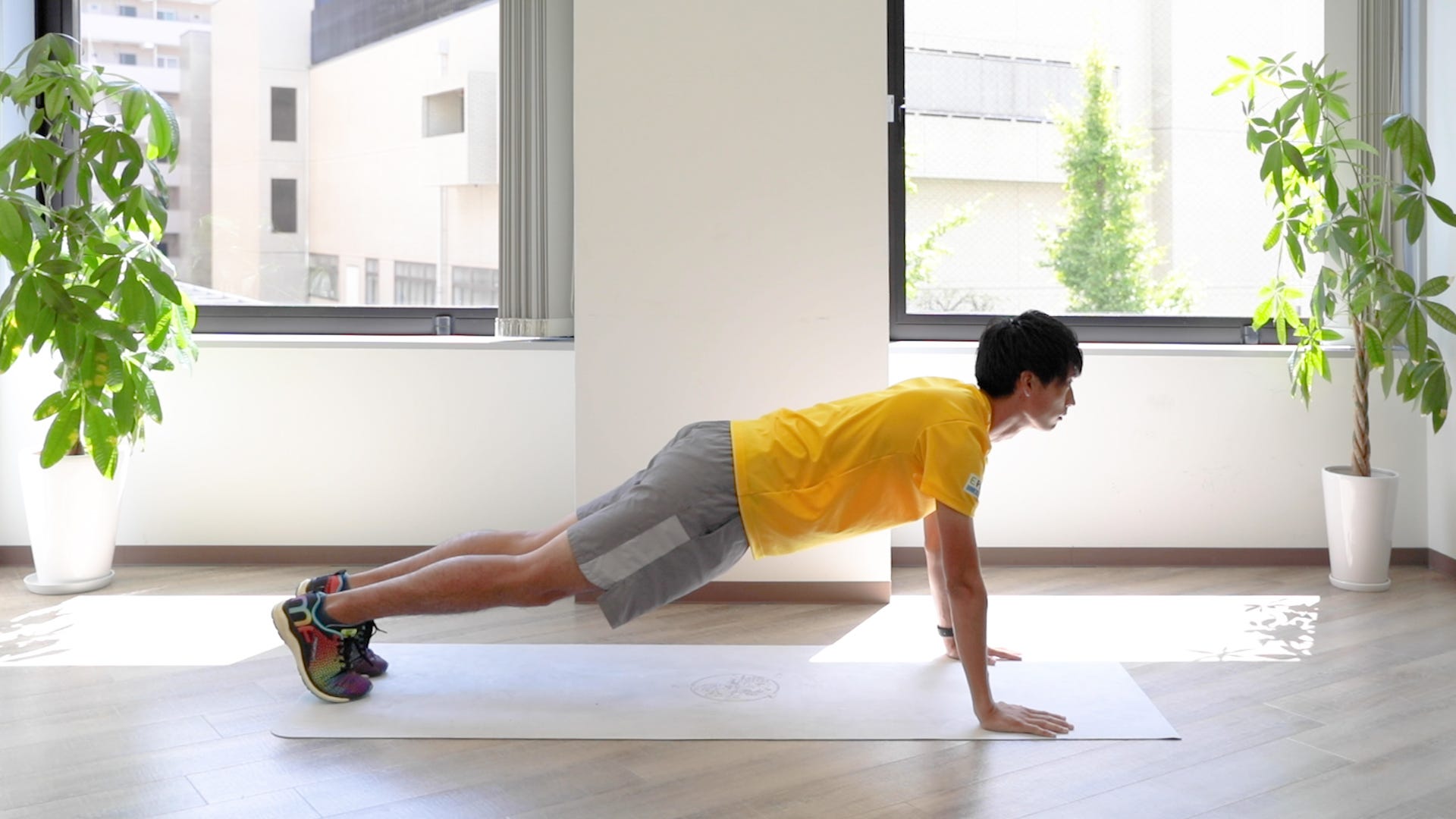 注意ポイントは、「お尻を高く上げない」「頭・肩・腰・膝・カカトは一直線になるよう姿勢をキープする」「頭は常に床の方向を見て、動かさない」です。