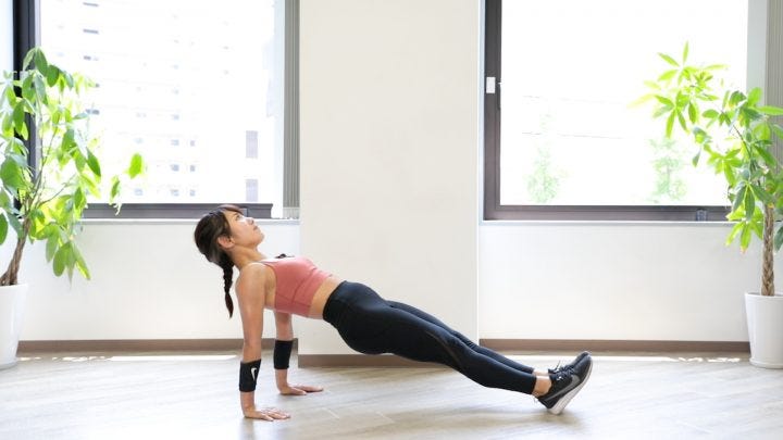 肘を曲げないハイプランクも、体幹強化のほか腕や肩の筋持久力向上におすすめです。60秒ほど行いましょう。