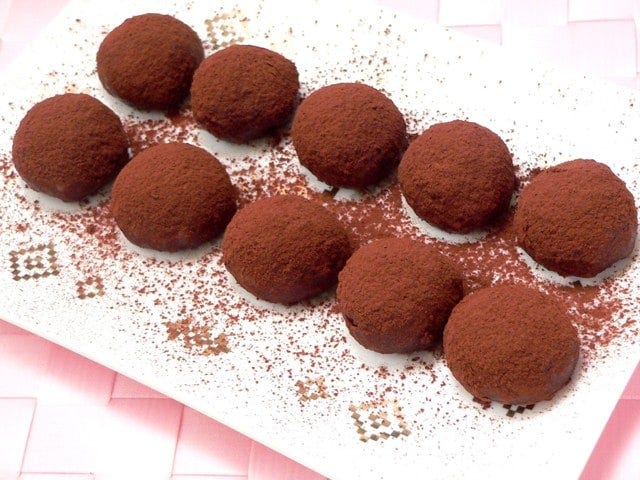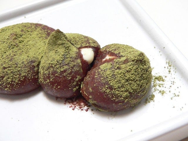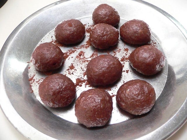 ココアを敷いた皿に、丸めたチョコ餅をのせる。