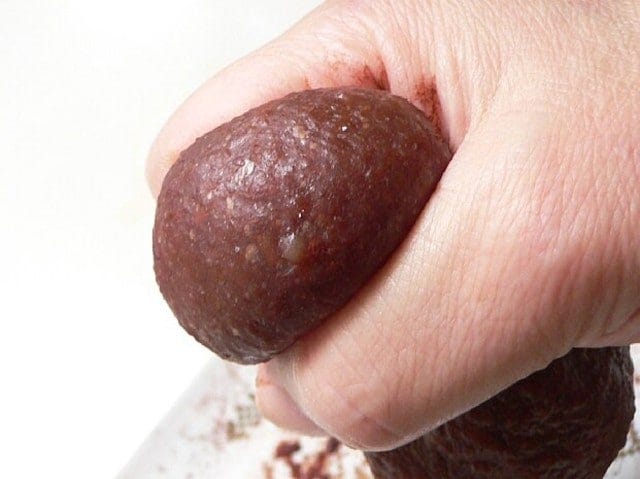 手で軽くこねてなめらかな餅にする。餅を右手で握り、親指と人差し指で輪を作って押し出し、千切って丸める(1個18gぐらいを10個)。