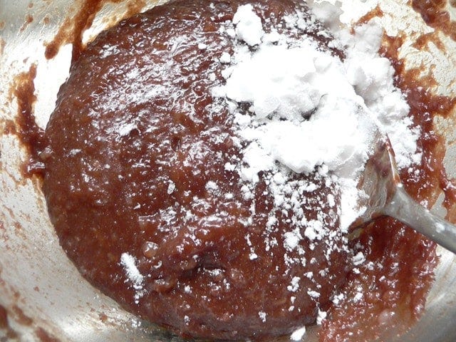 片栗粉を加えて、スプーンで混ぜる。ココアを敷いた皿の上に取り出して少し冷ます。