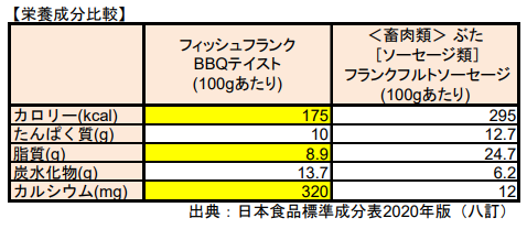 魚肉が主原料なので、一般的な畜肉のフランクフルトソーセージと比較するとカロリーや脂質も控えめです。