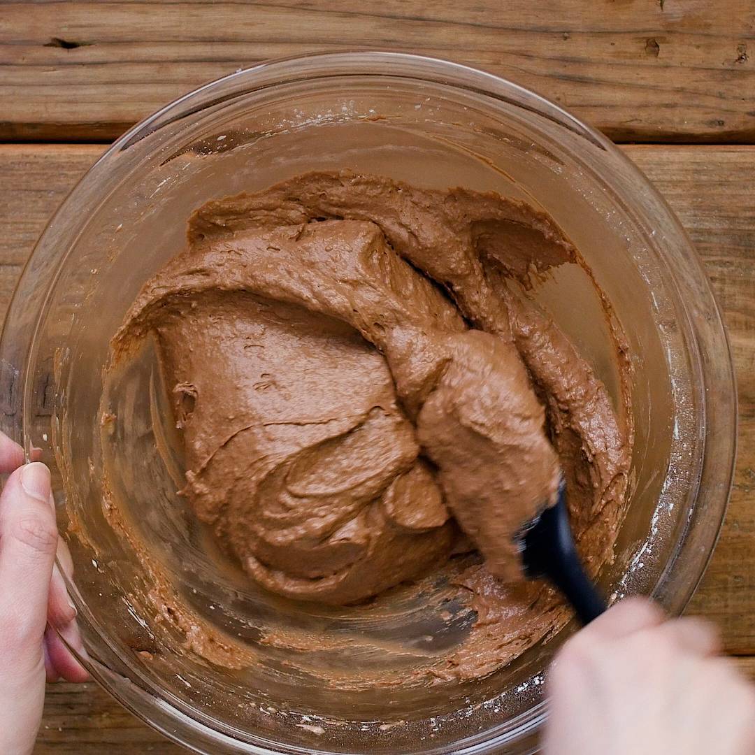 薄力粉、ココアパウダーをふるい入れ、ゴムベラで混ぜ合わせます。