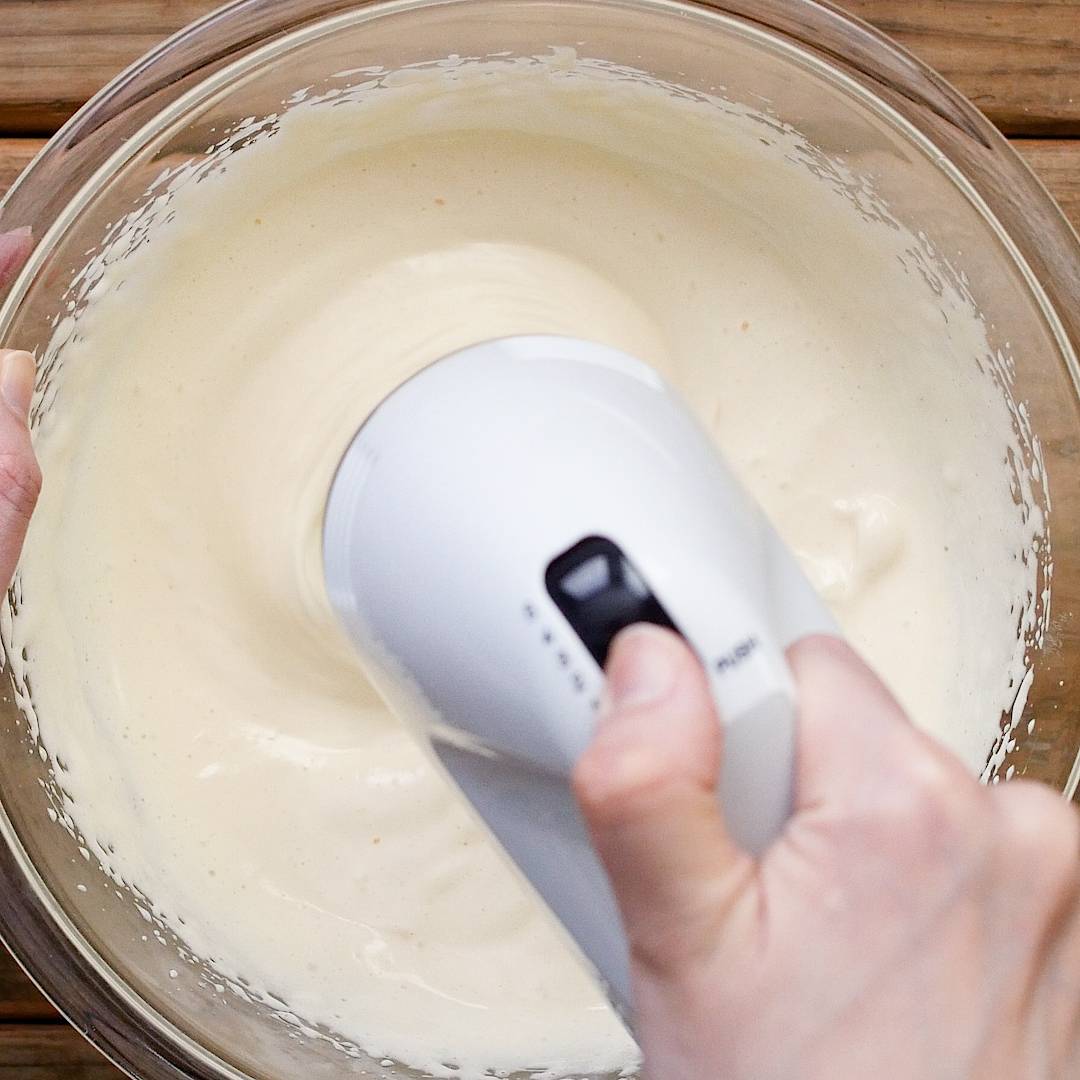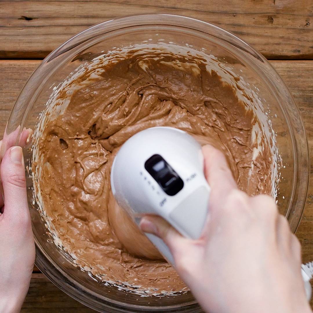 溶かしたチョコレート、豆腐を加え、ハンドミキサーでさらに混ぜ合わせます。