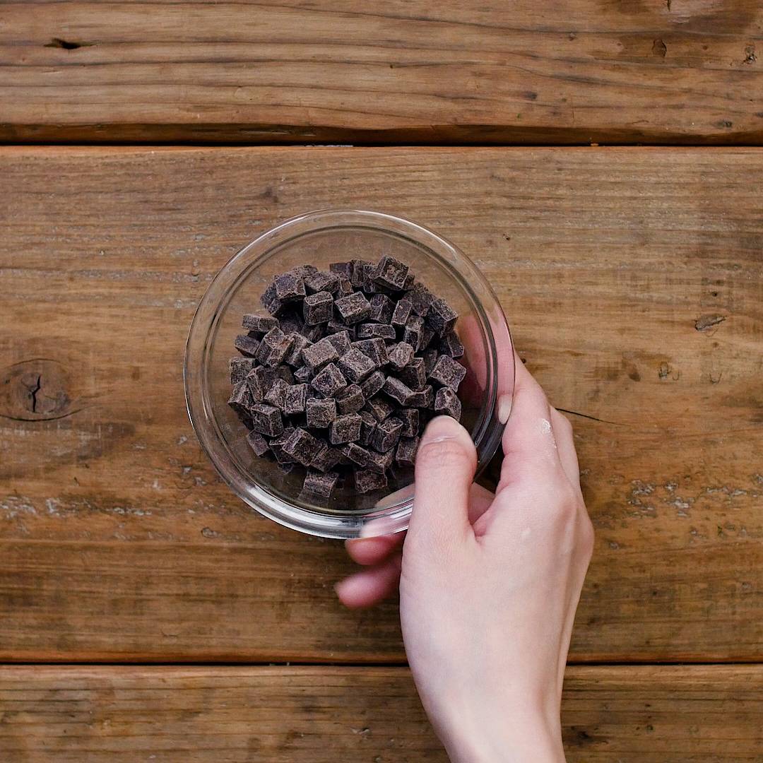 耐熱ボウルにチョコレートを入れ、レンジ600Wで1分ほど加熱して溶かします。