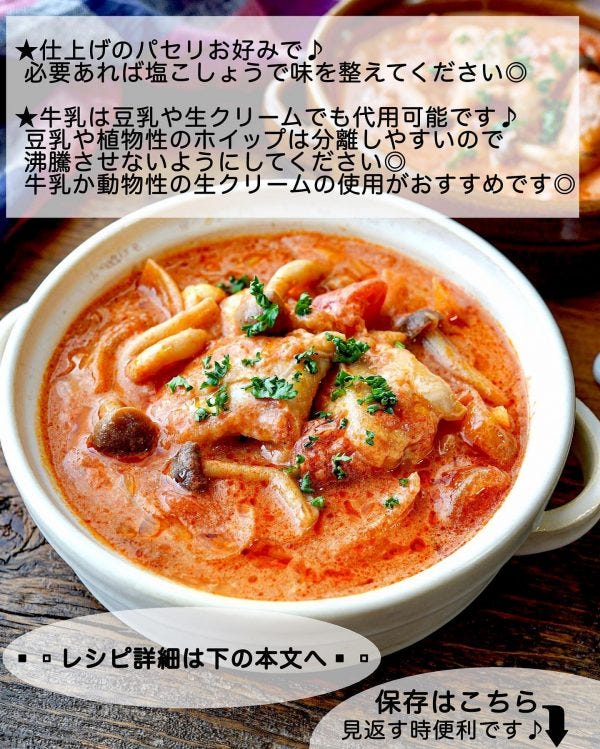 トマトの色味がパッと鮮やかで、見た目もおしゃれなトマトクリーム煮。
