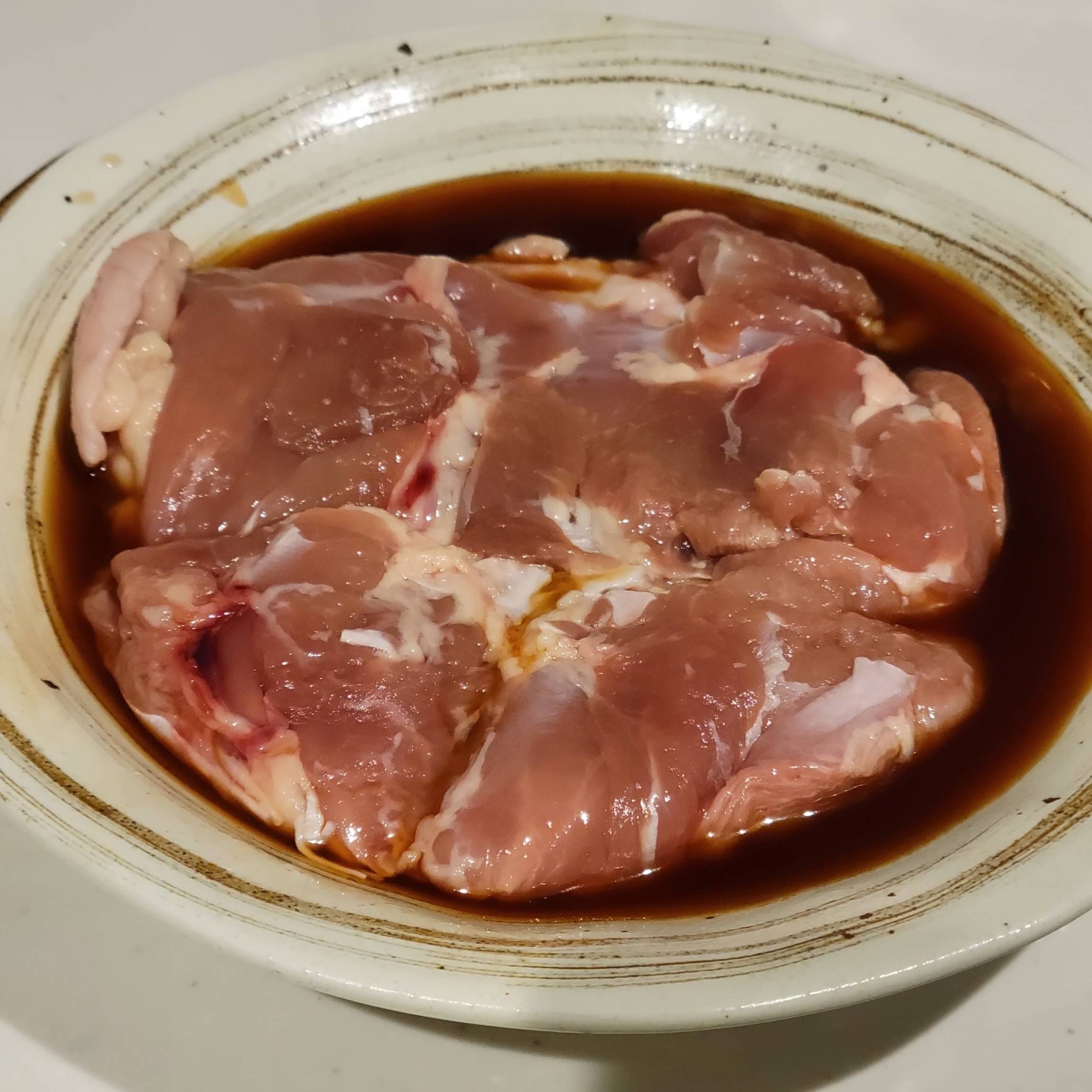 鶏肉の皮面を下にして①のたれに浸し、ラップをかけずに電子レンジ600Wで4分30秒加熱します。