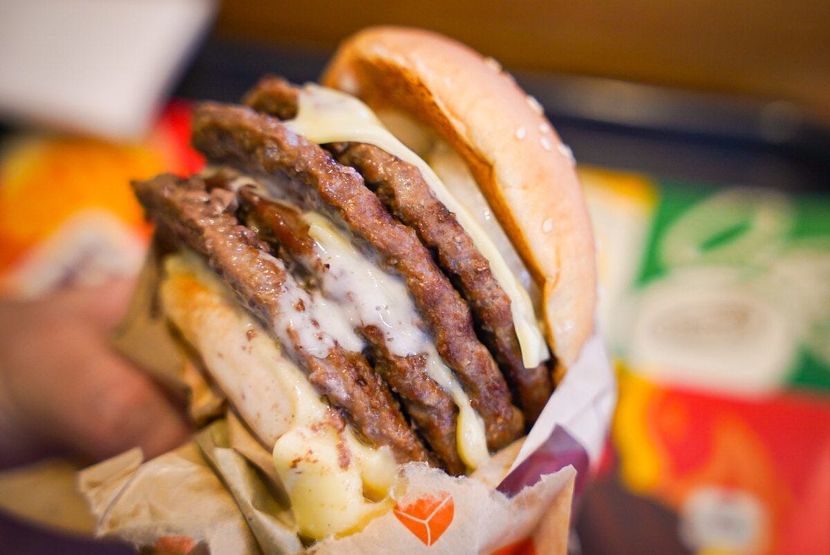 早速一口かぶりつくと...くっ美味いじゃねぇか...! お行儀よく重なった4枚のパティの肉々しさ、これでもかと詰め込まれたゴーダチーズスライスのコク、そしてそれらを包み込むホワイトチーズソースの濃厚な味わいの全てが相性抜群。