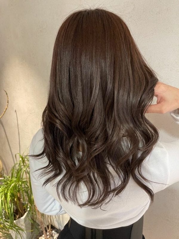 しっかりと暗めの色合いに仕上がっていますが、アッシュブラウンの柔らかい髪色のおかげで、表情まで柔らかく女性らしい雰囲気になりますよ。