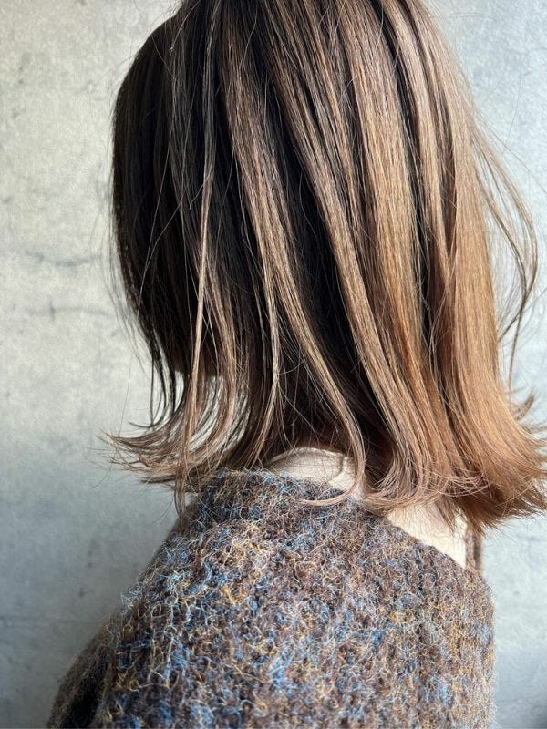 人気のレイヤーボブと組み合わせると、毛先がほどよく明るい髪色に見えるのでおすすめですよ。自然なツヤや透明感も出ますね。
