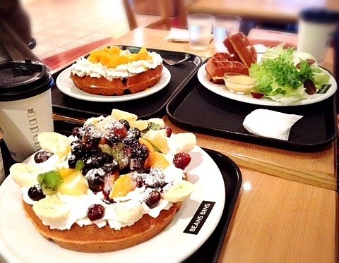 韓国のカフェチェーンBEANS BINS COFFEE(ビンスビンスコーヒー)。このカフェは観光地にほとんどあるチェーン店のカフェなのですが、メニューのクオリティがとっても高いんです。中でも人気なのは焼きたてワッフル。ワッフル以外にもたっぷりフルーツを使ったメニューがたくさん!