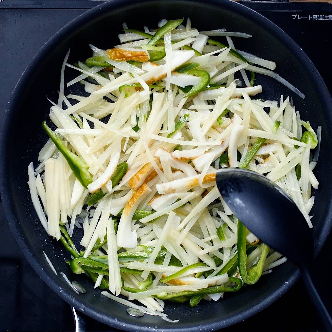 フライパンにごま油を引いて熱し、じゃがいもが透き通ってきたら、ピーマン、ちくわを加えて炒め合わせます。