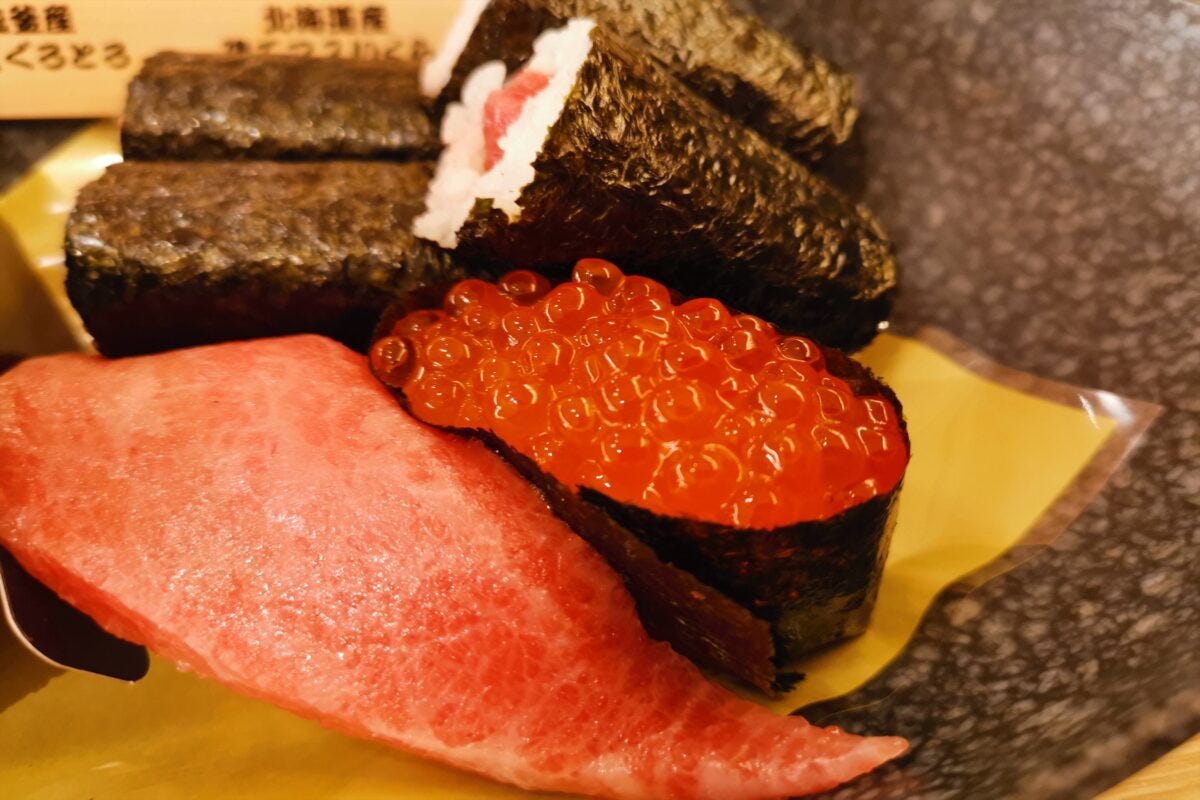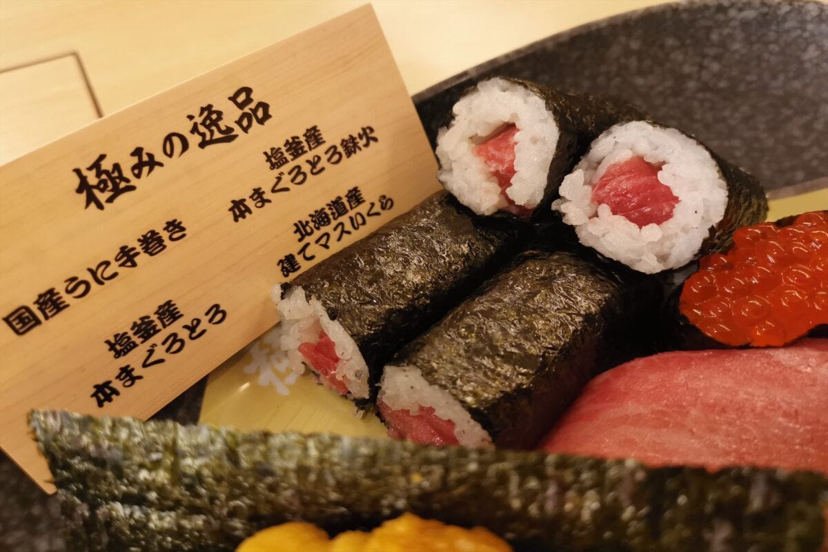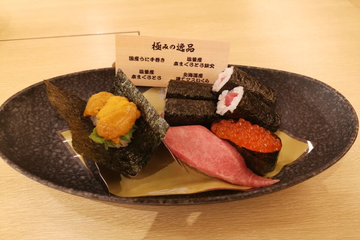 たとえばこちらの「豪華国産づくし」は、国産うに手巻きに宮城・塩釜産の本まぐろとろ、おなじく塩釜産の本まぐろとろ鉄火、北海道産の建マス(カラフトマス)いくら軍艦がセットになって、980円。