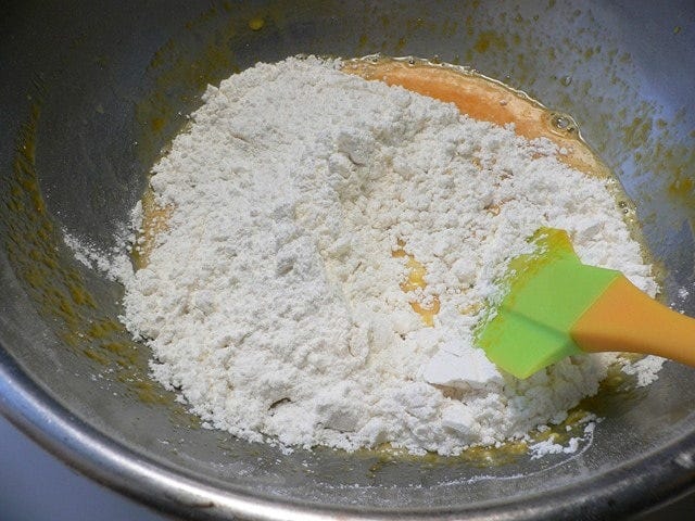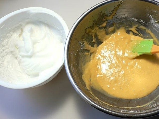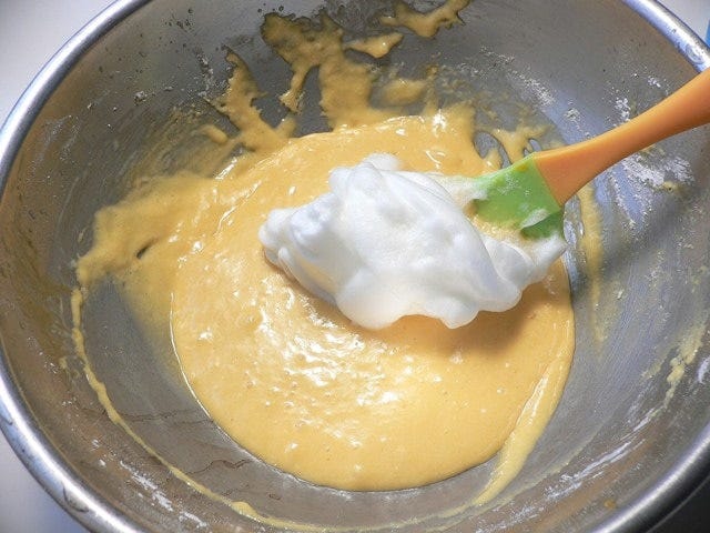 生地に、泡立てた卵白を1/3ほど加えてしっかりめに混ぜる。続けて残り全部を入れ、ボウルの底を大きくすくうようにしながら、練らないよう気をつけて混ぜる。 最初に少し卵白を混ぜて、生地を柔らかくしてから、残りの卵白をサックリ混ぜる。
