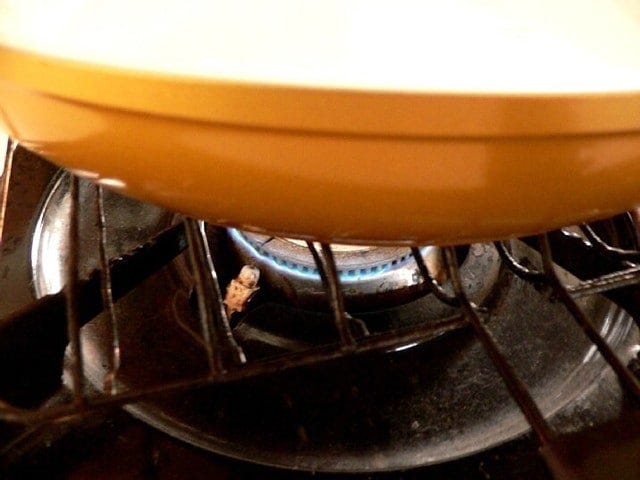 火加減がとろ火に調節できない場合は、写真のように、コンロの上に魚焼き網か餅焼き網をのせて、その上にフライパンをのせて焼くと良い。