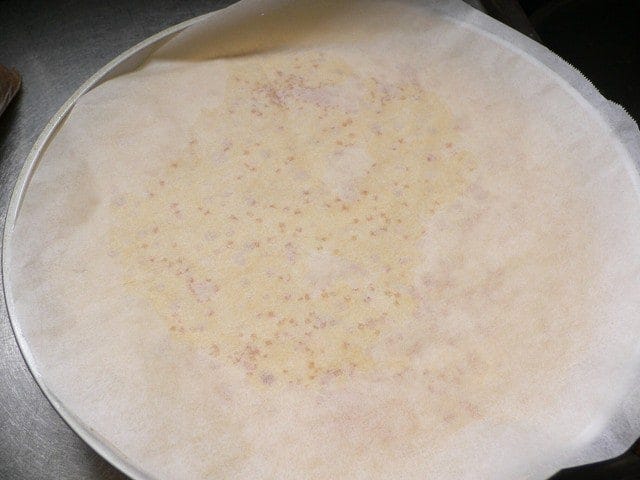 焼けたらオーブンペーパーを引っ張って外す。簡単に外れるが、つけたままでもかまわない。