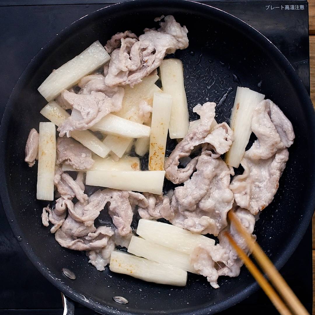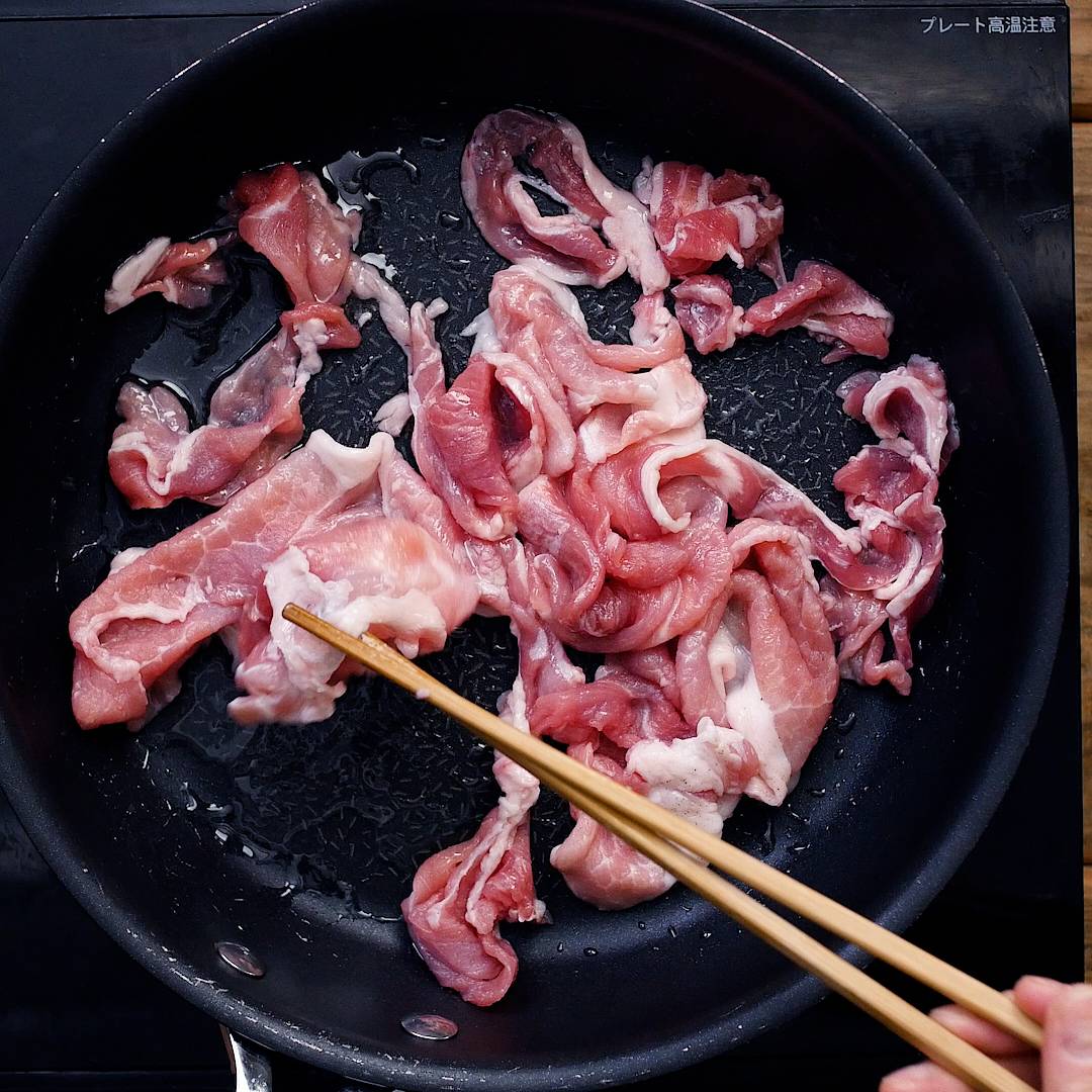 フライパンにサラダ油を引いて熱し、豚こま肉を入れて炒めます。