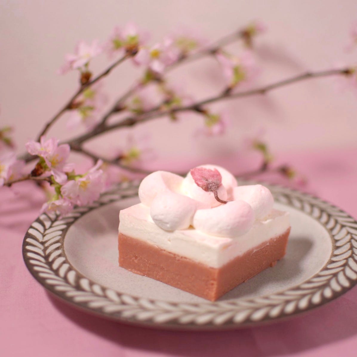 上の層は北海道産のクリームチーズをムース状にし、下の層はスペイン産のクーベルチュールホワイトチョコレートをベースに、国産の桜の花と葉を塩漬けしてペースト状にしたものを練り込み、焼き上げている。上下の層を一緒に食べることで桜の味わいがより引き立ち、春らしさを味でも楽しむことができる。