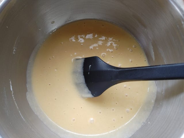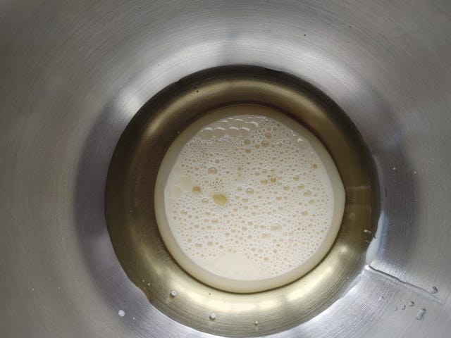 ② ボールをはかりの上に置き、米油と無調整豆乳を計りながら加え、白く乳化するまでホイッパーでよく混ぜる。