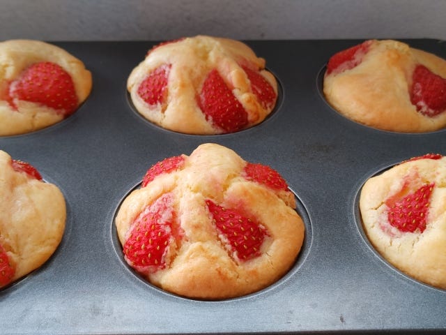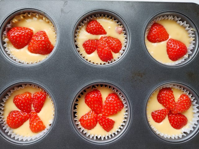 ⑤ スプーンでマフィン型に生地を入れる。トップにもいちごを飾り、170度のオーブンで22分くらい焼く。
