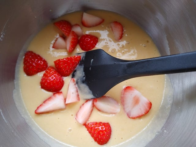 ④ 湯せんから外し、米粉のホットケーキミックスを加え混ぜ、カットしたいちごも加え混ぜる。