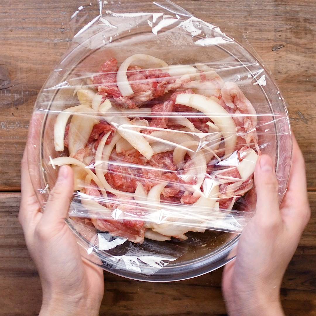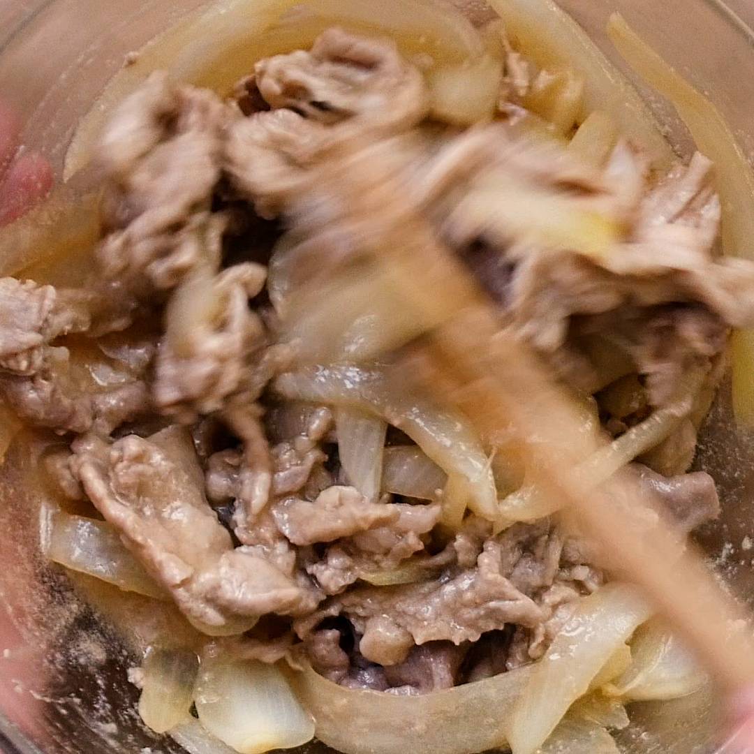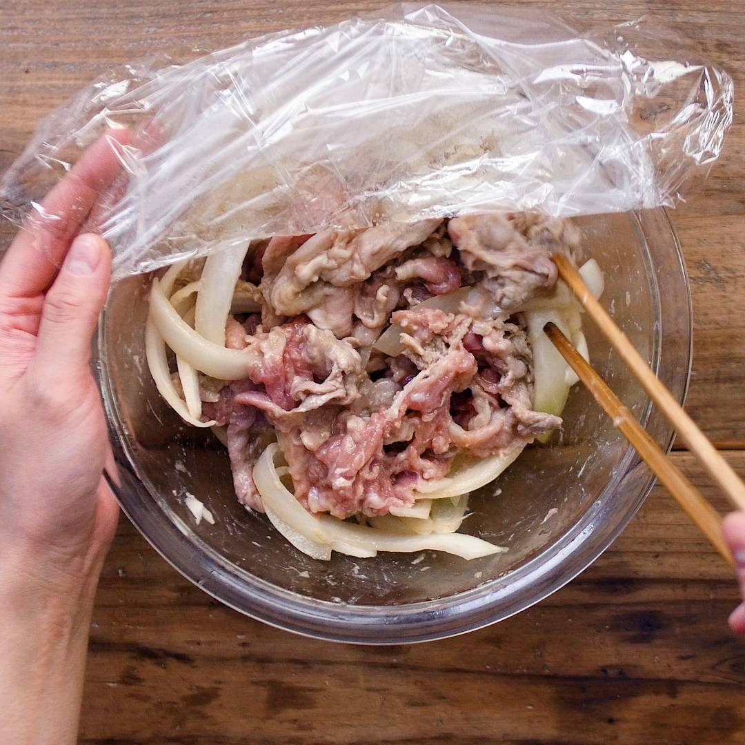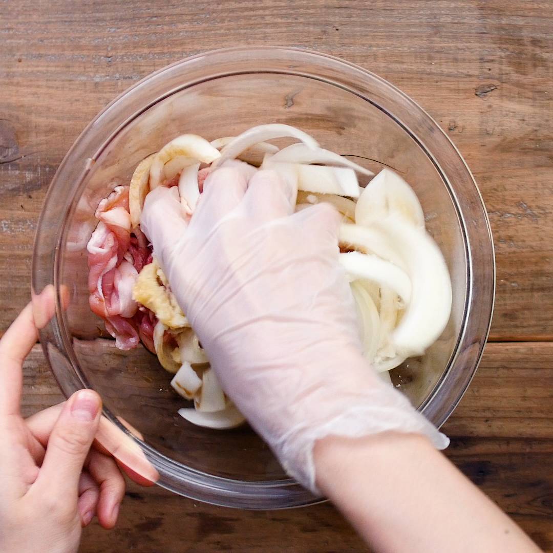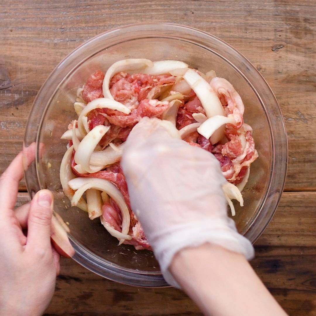 ボウルに豚こま肉、玉ねぎ、(a) を入れて揉み込みます。