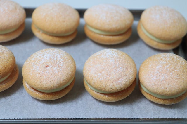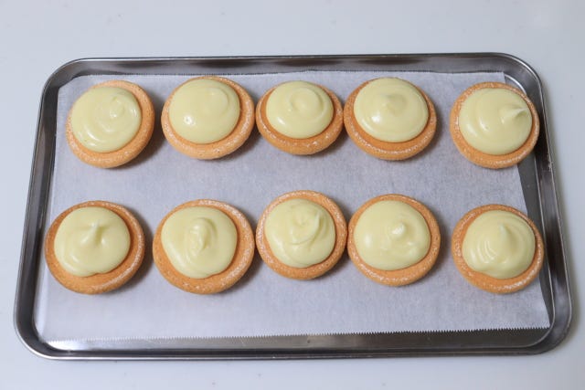⑤ ブッセ生地を二つで一組にし、片方の生地の裏側にホワイトチョコガナッシュを等分に絞る。