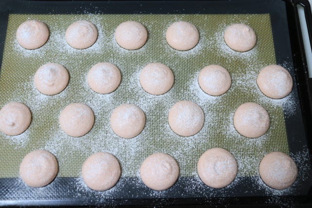 ⑦ 粉糖を茶漉しで2回かけ、170℃に予熱したオーブンで約12分焼成。